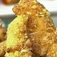 3°- Coloque numa assadeira 3 xícaras (chá) de farinha de milho flocada, 1 ½ xícara (chá) de queijo parmesão ralado (para empanar) e 2 sachês de caldo de frango e misture. Passe os filés de frango nessa mistura de farinha e frite em óleo quente até dourar. Retire e escorra em papel absorvente. Sirva em seguida.