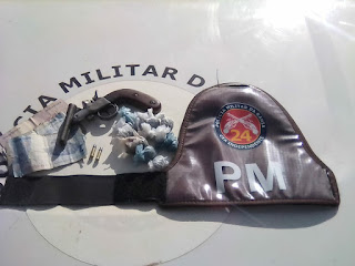 Já na tarde desta quarta-feira, 08 de agosto, policiais militares do 5° Pelotão em Ourolândia, comandado pelo Subtenente PM Manoel Messias de Oliveira, ao realizarem rondas de rotina, deparou-se com um indivíduo que, ao avistar a viatura policial, tentou empreender fuga, porém foi alcançado pelos policiais. Durante a abordagem policial, foi flagrada na cintura do individuo uma arma de fogo do tipo pistola de dois canos e nos bolsos uma embalagem contendo 11 (onze) trouxinhas de uma substância análoga a Cannabis Sativa (Maconha) e 15 reais em espécie.