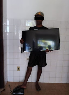 Diante de informações colhidas no local, foi chegado ao suspeito do arrombamento. Trata-se de um jovem de 20 anos de idade, residente do mesmo Distrito, sendo encontrado escondido em sua residência este Televisor, bem como demais objetos furtados do Posto de Saúde. O acusado, juntamente com os produtos do furto, foi conduzido para a sede da 16ª COORPIN em Jacobina para que medidas cabíveis fossem tomadas.