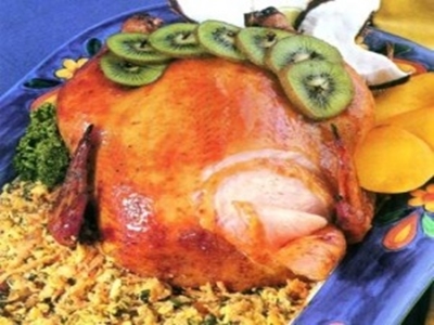 Leve ao fogo uma panela com a manteiga, a cebola, o alho socado e deixe dourar. Junte as azeitonas, as passas, o chester defumado, a cenoura, o abacaxi, a maçã e a farinha de milho. Por último, acrescente o cheiro-verde e o sal. Misture bem e reserve. Retire o papel alumínio do chester e deixe dourar por mais 30 minutos. Coloque o chester numa bandeja, arrume a farofa ao redor e decore com as fatias de manga, o kiwi e o coco em pedaços.
