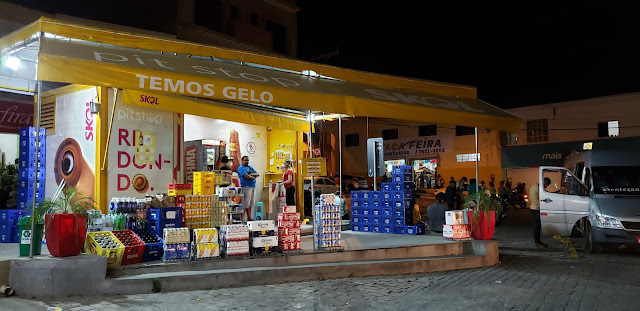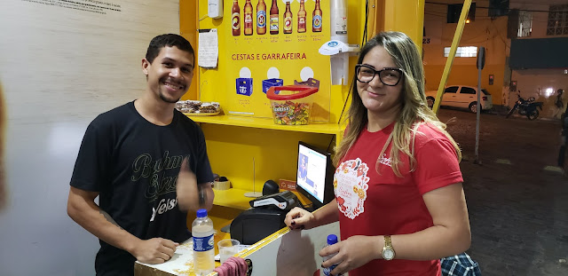 Início da noite de terça-feira, 11 de junho de 2019, e aqui na Praça do Texaco em Jacobina, clicamos o Léo Jaime atendendo a Vânia Safira no Pit Stop Skol.