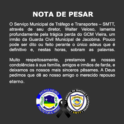 O Serviço Municipal de Tráfego e Transportes – SMTT, através de seu diretor, Walter Veloso, lamenta profundamente pela trágica perda do GCM Vieira, um irmão da Guarda Civil Municipal de Jacobina. Pouco pode ser dito ou feito perante o único adeus que é definitivo e, nestas horas, sobram as palavras.
