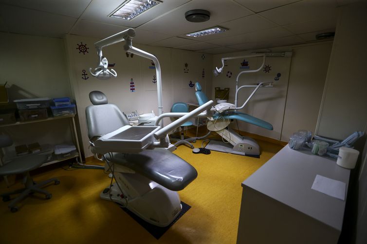 | Consultório odontológico do Navio Auxiliar Pará, que inicia deslocamento para levar cestas básicas a comunidades do arquipélago de Marajó - Marcelo Camargo/Agência Brasil |