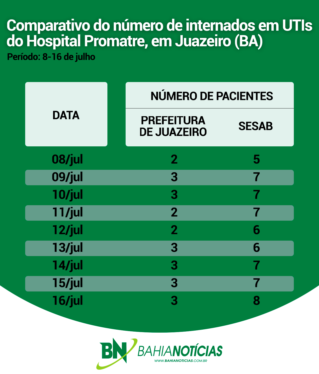 A título de comparação, o hospital fechou a quarta-feira (15) com oito pacientes em leitos de UTI, conforme dados que o diretor relata ter repassado à Sesab. O boletim divulgado à imprensa pela prefeitura registrou três internados nesta condição, no mesmo dia. Nesta sexta (17), a unidade tem oito hospitalizados em UTIs Covid-19, um a menos que na quinta (16), quando a Promatre informou à Sesab ter nove internados. A prefeitura, no entanto, divulgou três no seu informativo do dia anterior.
