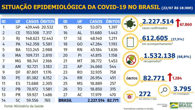 O número de casos confirmados acumulados do novo coronavírus no Brasil chegou a 2.227.514. Hoje (22), no painel do Ministério da Saúde, pode-se observar o maior registro de novos diagnósticos positivos de covid-19 em 24 horas desde o início da pandemia, 67.860.