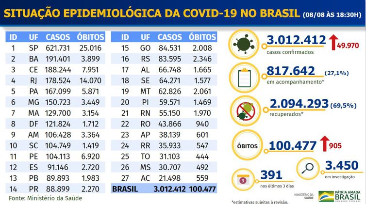 Dos 3.012.412 casos de pessoas infectadas pelo novo coronavírus, 2.094.293 (69,5%), mais da metade, são de recuperados. Desde ontem (7), foram anotados 49.970 novos casos informados pelas secretarias de saúde. O balanço aponta ainda que o número de pessoas em acompanhamento é de 817.642 (21,1%).