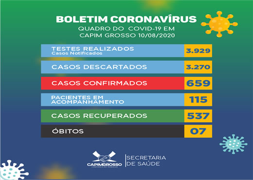 A Secretaria Municipal de Saúde, por meio da Vigilância Epidemiológica, informa que, nesta segunda-feira, 10 de Agosto, 21 (vinte e uma) pessoas encontram-se devidamente recuperadas da COVID-19, foram notificados e confirmados mais 17 (dezessete) novos casos POSITIVOS para COVID-19, sendo destes, 08 (oito) resultados informados pelo LACEN.