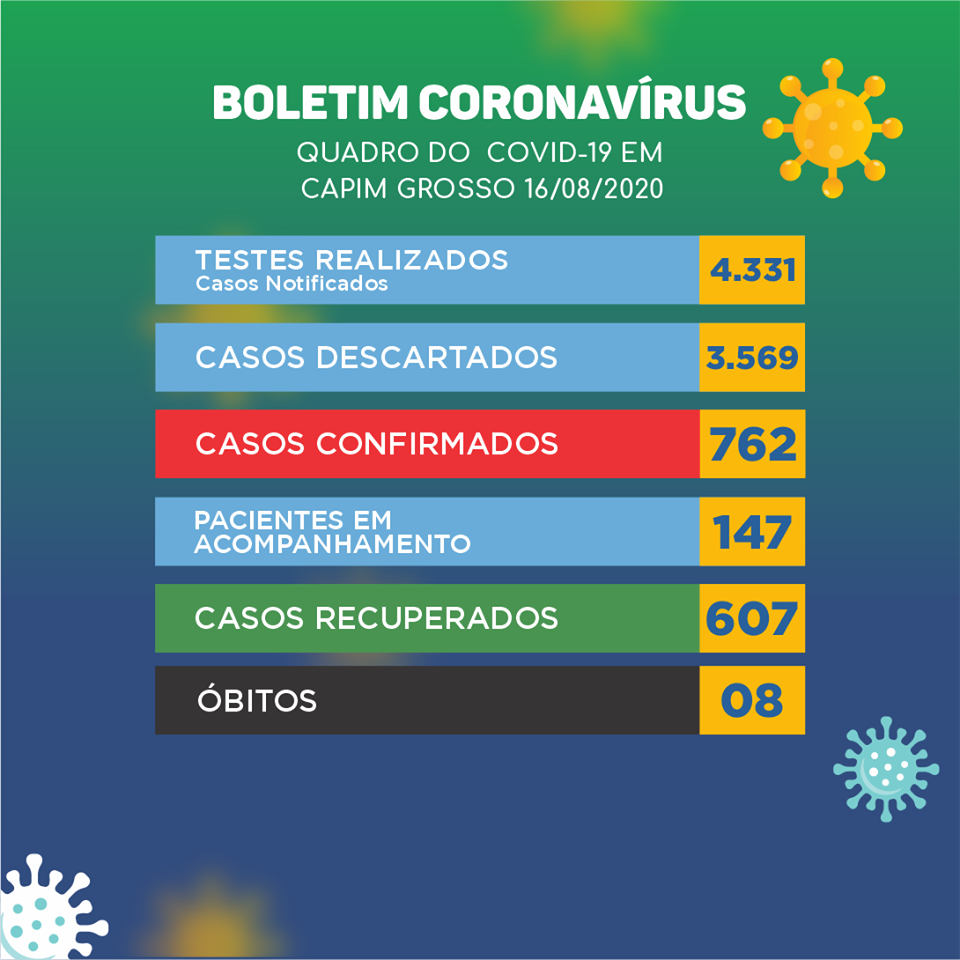 A Secretaria Municipal de Saúde, por meio da Vigilância Epidemiológica, informa que, neste domingo, 16 de Agosto de 2020, foram notificados e confirmados mais 02 (dois) novos casos POSITIVOS para COVID-19 e 01 (um) óbito.