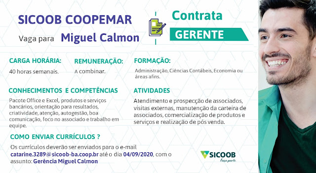 A agência do Sicoob Coopemar, em Miguel Calmon, está contratando para a vaga de gerente. Os interessados deverão enviar currículos para o e-mail catarine.3289@sicoob-ba.coop.br até o dia 04 de setembro de 2020.