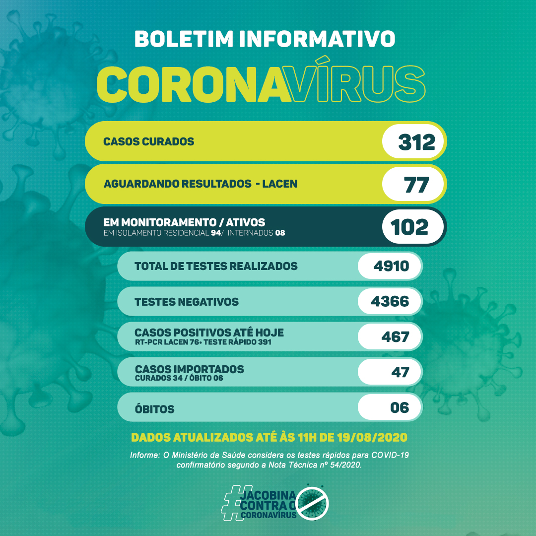O município chegou hoje à 467 casos confirmados do início da pandemia até aqui, lembrando que destes, 312 já estão recuperados, 47 são casos importados (pessoas de outras cidades realizando testes em Jacobina), 06 óbitos e 102 ainda aguardam alta médica (94 em isolamento residencial e 08 internados).