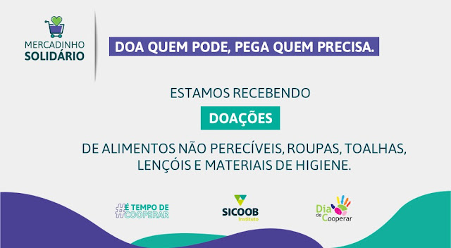 Até o dia 04/09, o Sicoob Coopemar receberá doações de alimentos não perecíveis, roupas, toalhas, lençóis e materiais de higiene. Todos os itens serão destinados a famílias carentes no dia 05/09. Para contribuir, basta deixar a sua doação em um dos nossos nove pontos de atendimentos, dispostos em Mairi, São José do Jacuípe, Várzea da Roça, Serrolândia, Miguel Calmon, Jacobina, Juazeiro ou Petrolina/PE.