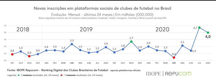A volta do Campeonato Brasileiro e da Copa do Brasil, no mês de agosto, fizeram com que o crescimento de inscrições nas redes sociais oficiais dos 50 maiores clubes de futebol do Brasil se mantivesse em alta. No período pós-pandemia, o mês de agosto registrou a entrada de 4 milhões de seguidores, o que representa a segunda maior alta, desde janeiro de 2017 – em julho passado foi registrado o recorde histórico de 4,7 milhões de inscrições. Os dados são do ranking digital do IBOPE Repucom, divulgado mensalmente com base em cinco plataformas – Facebook, Twitter, Instagram, YouTube e TikTok.