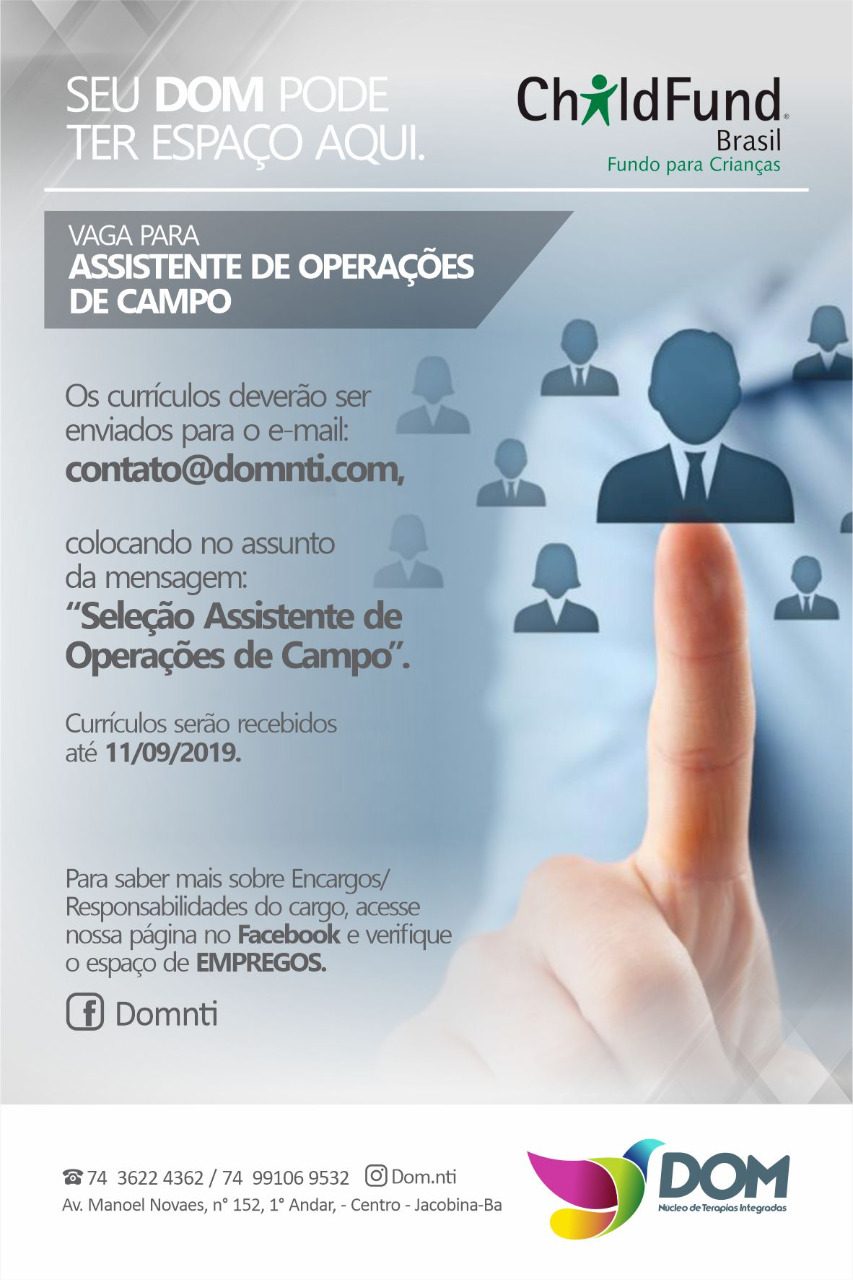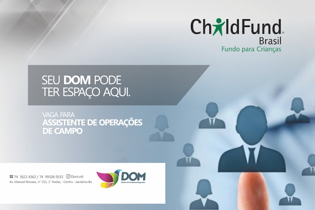 O Núcleo de Terapias Integradas - DOM, com sede em Jacobina, e o ChildFund Brasil – Fundo para Crianças, estão recrutando você, que deseja transformar o mundo com seu DOM. Procuramos por Assistente de Operações de Campo.