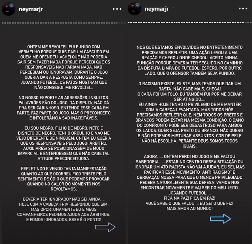 Minutos depois, Neymar postou um longo texto em suas redes sociais, fazendo mais um desabafo. Desta vez, porém, usou um tom mais pacífico e indicou arrependimento pela agressão ao adversário. Ao dizer que aceita sua punição, o brasileiro também pediu que González receba uma sanção.