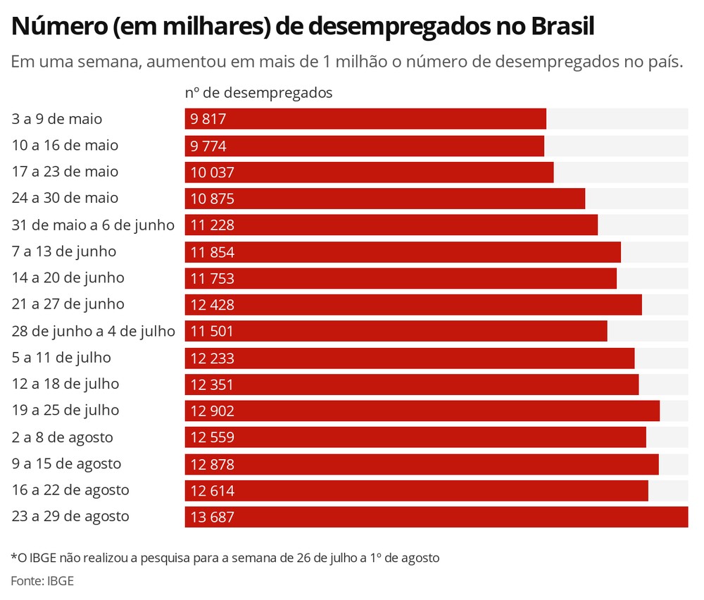 De acordo com o levantamento, entre a terceira e a quarta semana de agosto aumentou em mais de 1 milhão o número de desempregados no país, chegando a cerca de 13,7 milhões o total de trabalhadores em busca de uma oportunidade no mercado de trabalho.
