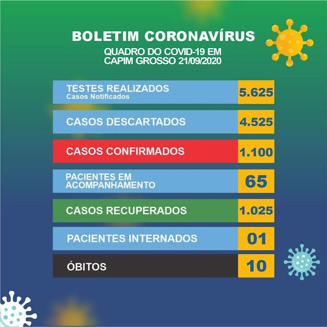 1.100 casos de coronavirus já foram confirmados em Capim Grosso, desde o início da pandemia