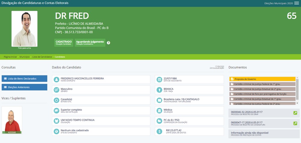A cidade de Licínio de Almeida, no centro-sul da Bahia, vai ter só um candidato a prefeito nas eleições 2020, de acordo com os dados do Tribunal Superior Eleitoral (TSE). O atual prefeito, Dr. Fred, vai tentar a reeleição. Dos 417 municípios do estado, Licínio de Almeida é o único com apenas um candidato disputando a chefia do executivo.