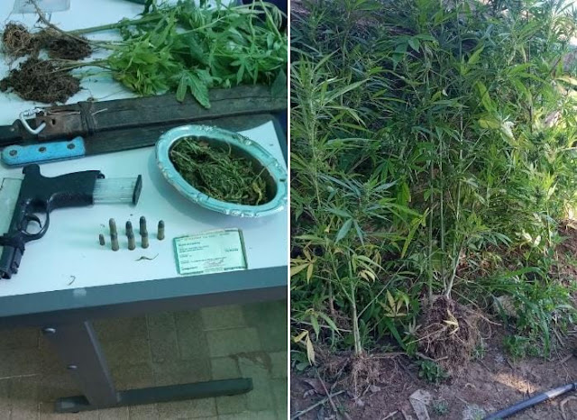 Munidos das informações, os policiais foram até o local, porém o proprietário da residência fugiu ao perceber a chegada da polícia. De imediato, iniciou-se a incursão no local, onde foram encontrados dentro da residência uma quantidade de maconha pronta para o consumo, 07 cartuchos intactos de revólver calibre 38 e um simulacro de pistola.