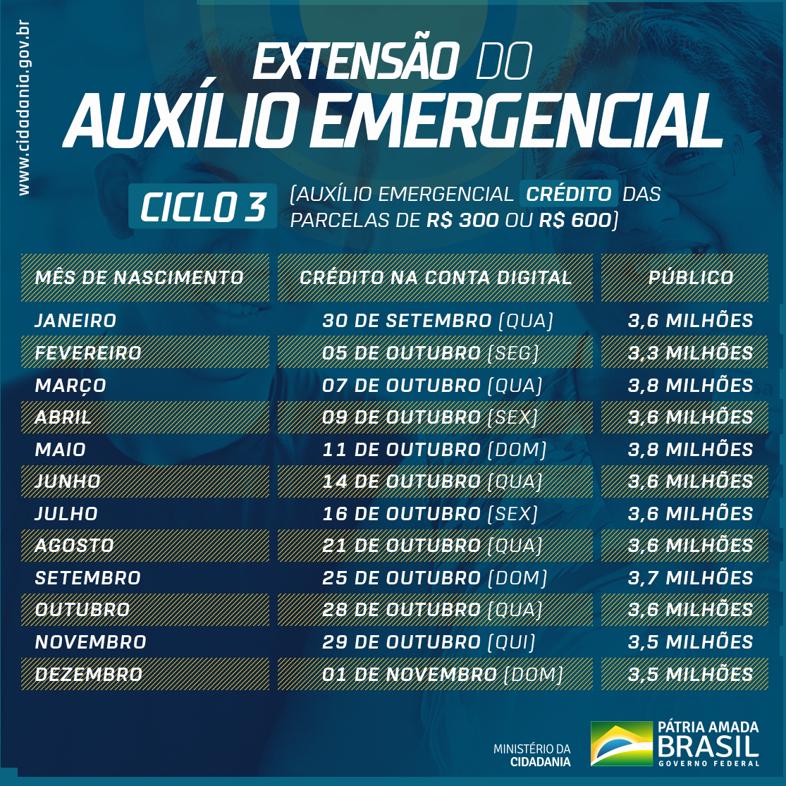 Eis o calendário completo, de acordo com o mês de nascimento, na imagem abaixo. As parcelas seguintes serão pagas também conforme calendário específico, já informado pela Caixa.