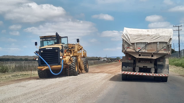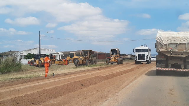 A Avenida Raimundo Cedraz, no trecho entre o Parque de Exposições e o bairro Mutirão, em Jacobina, passa por obras de pavimentação e o fluxo de veículos segue em apenas uma faixa na maior parte do dia, enquanto homens e máquinas trabalham.