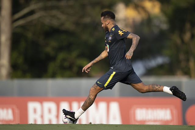 Nas imagens do treino divulgadas pela CBF, foi possível ver Neymar levando as mãos às costas e agachando no gramado em alguns momentos durante a roda de bobinho. Depois, o atacante não apareceu na transmissão.