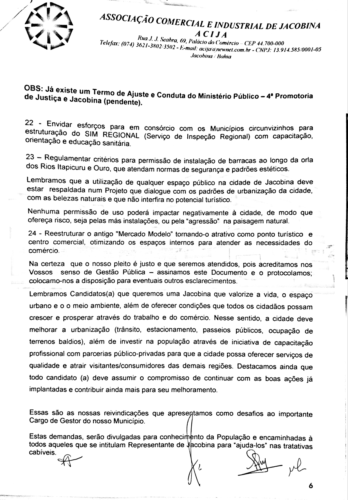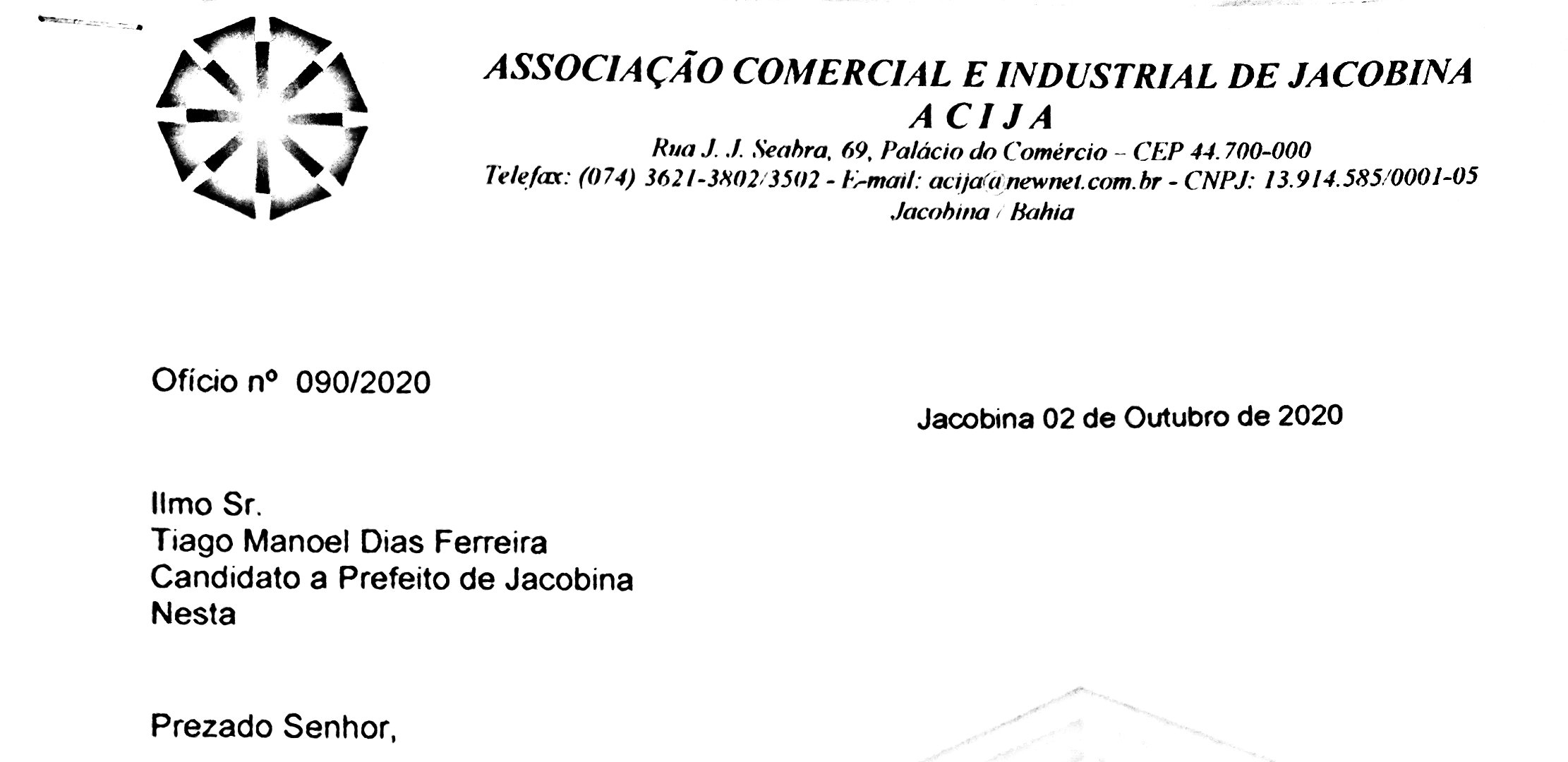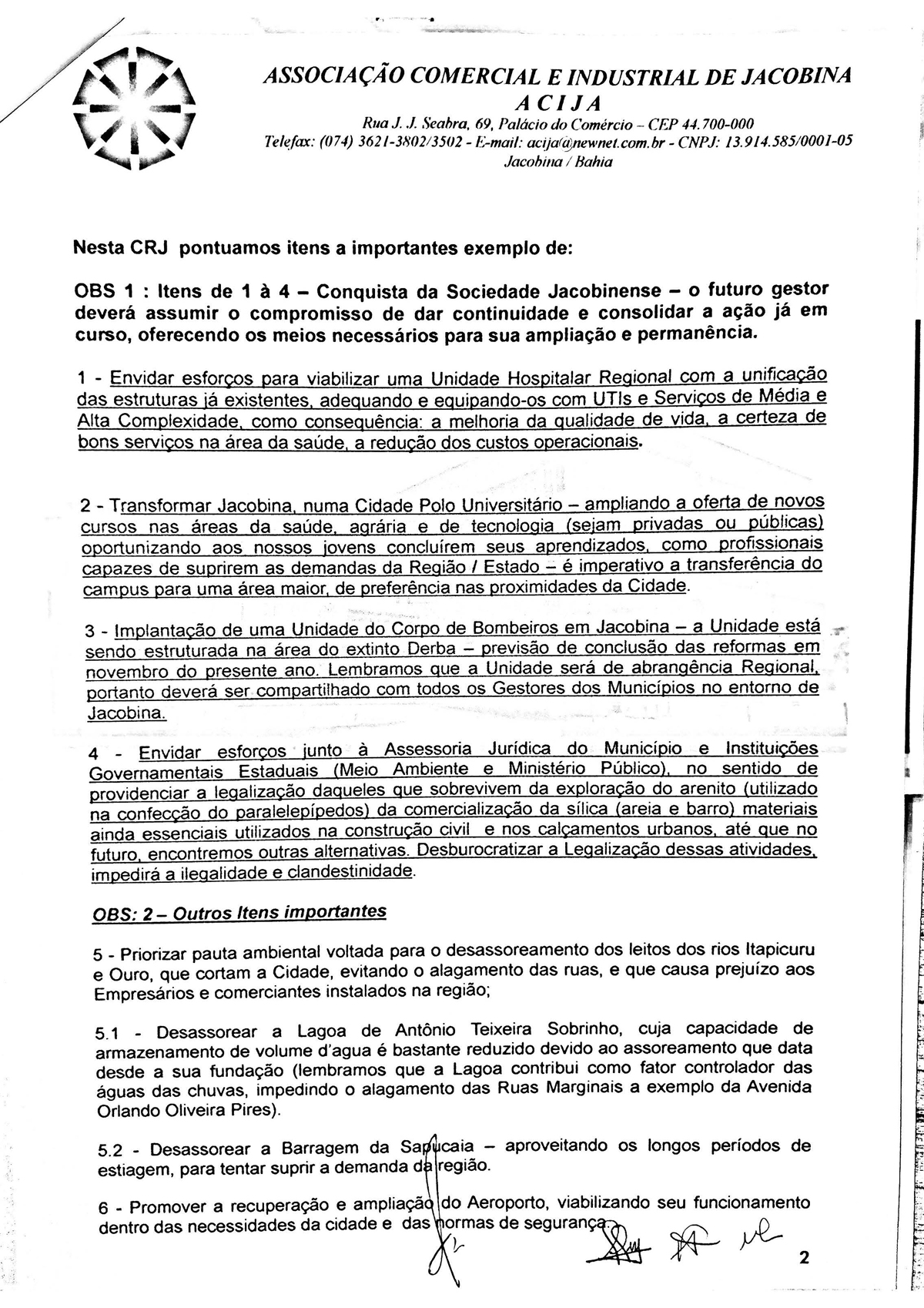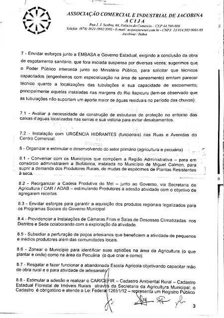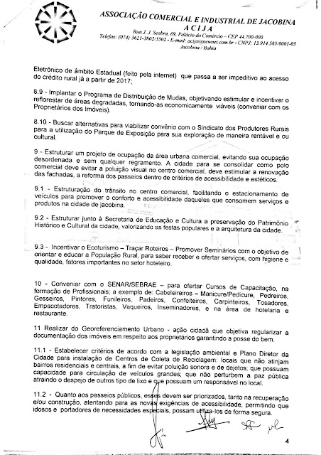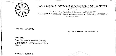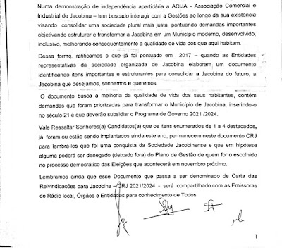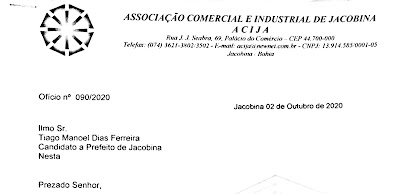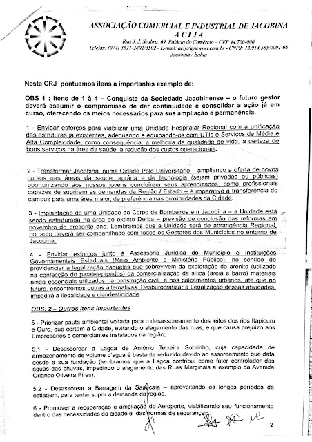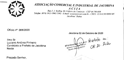 A Associação Comercial e Industrial de Jacobina - Acija, por meio da sua diretoria executiva protocolou um documento com os candidatos a prefeito de Jacobina, denominado “Carta das Reinvindicações para Jacobina”, cujo objetivo foi pontuar demandas estruturantes para a cidade, inserindo o município num processo de desenvolvimento do Século XXI, tornando o aqui viver melhor.
