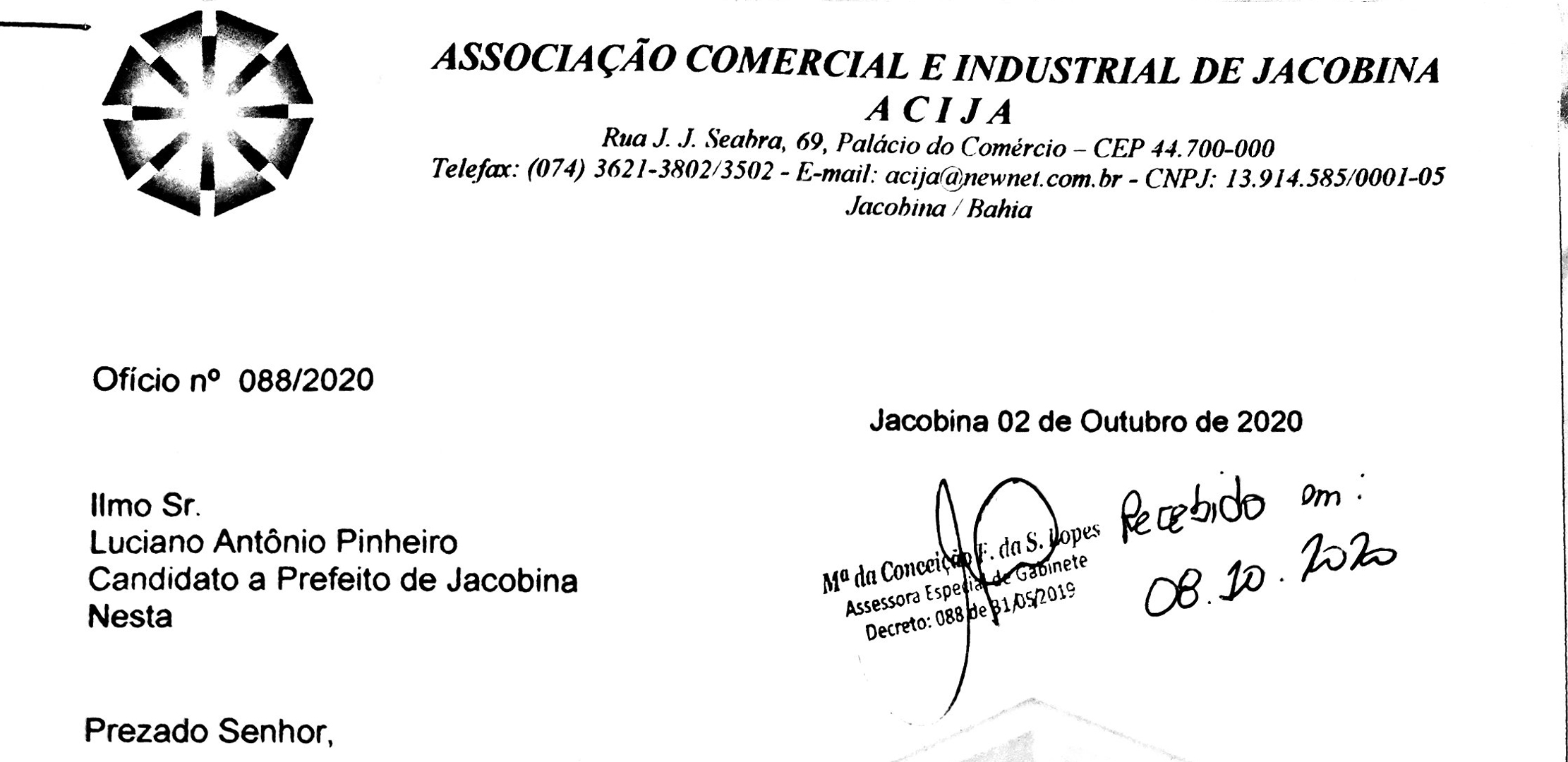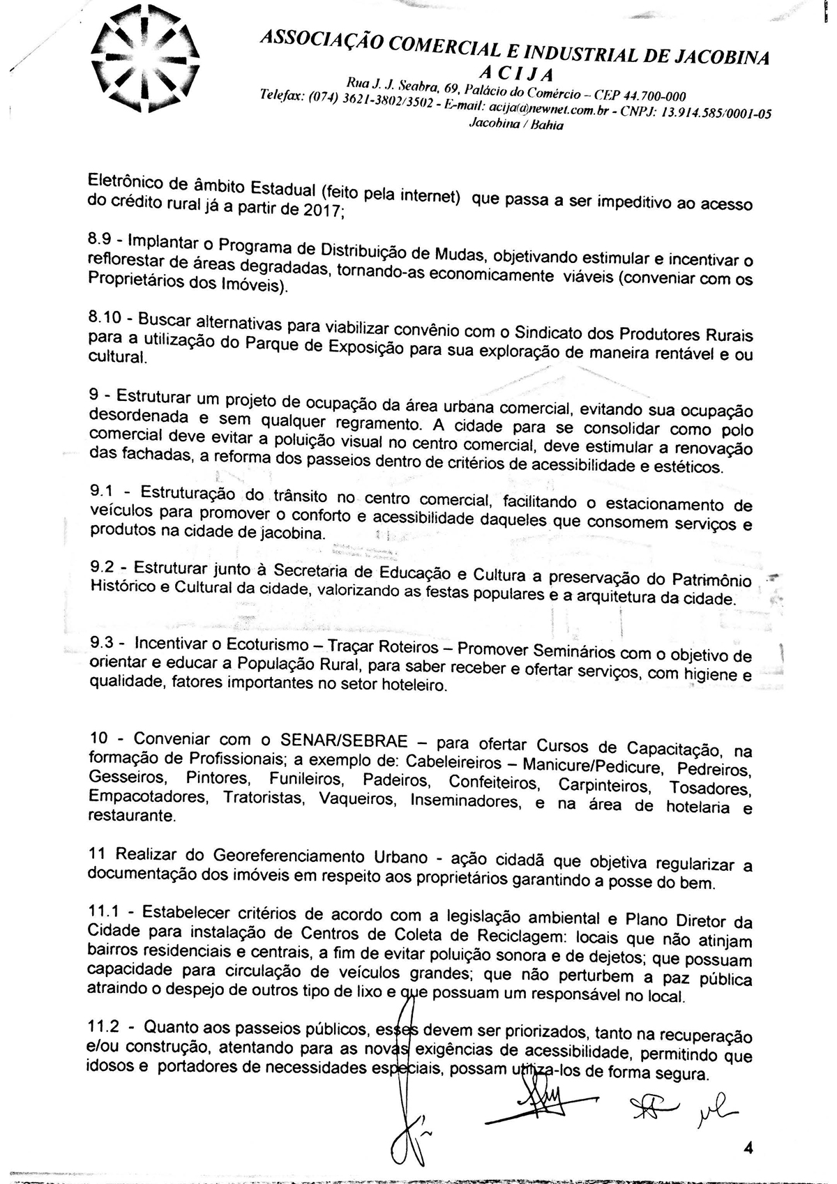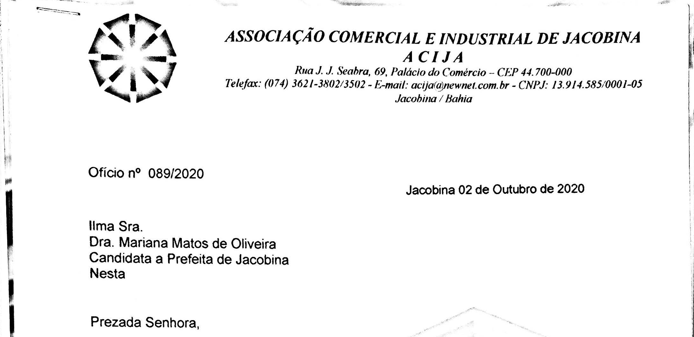 A Associação Comercial e Industrial de Jacobina - Acija, por meio da sua diretoria executiva protocolou um documento com os candidatos a prefeito de Jacobina, denominado “Carta das Reinvindicações para Jacobina”, cujo objetivo foi pontuar demandas estruturantes para a cidade, inserindo o município num processo de desenvolvimento do Século XXI, tornando o aqui viver melhor.