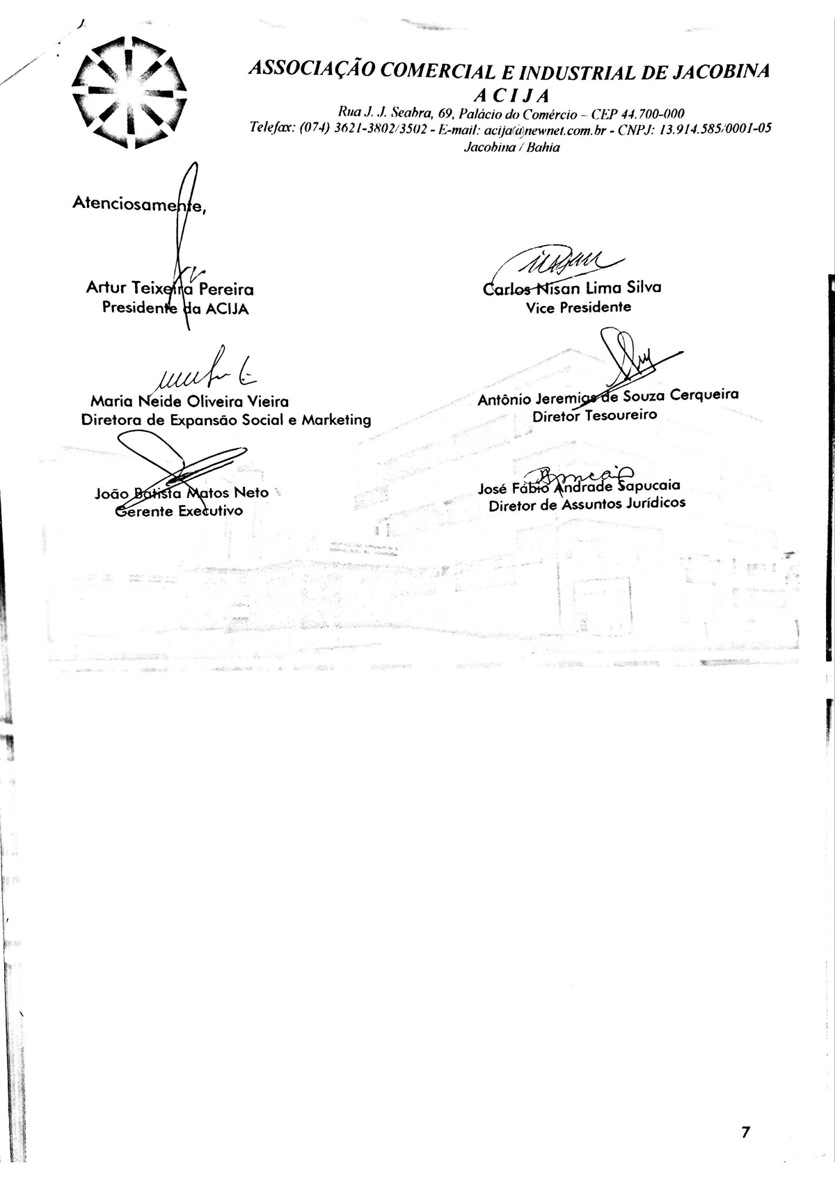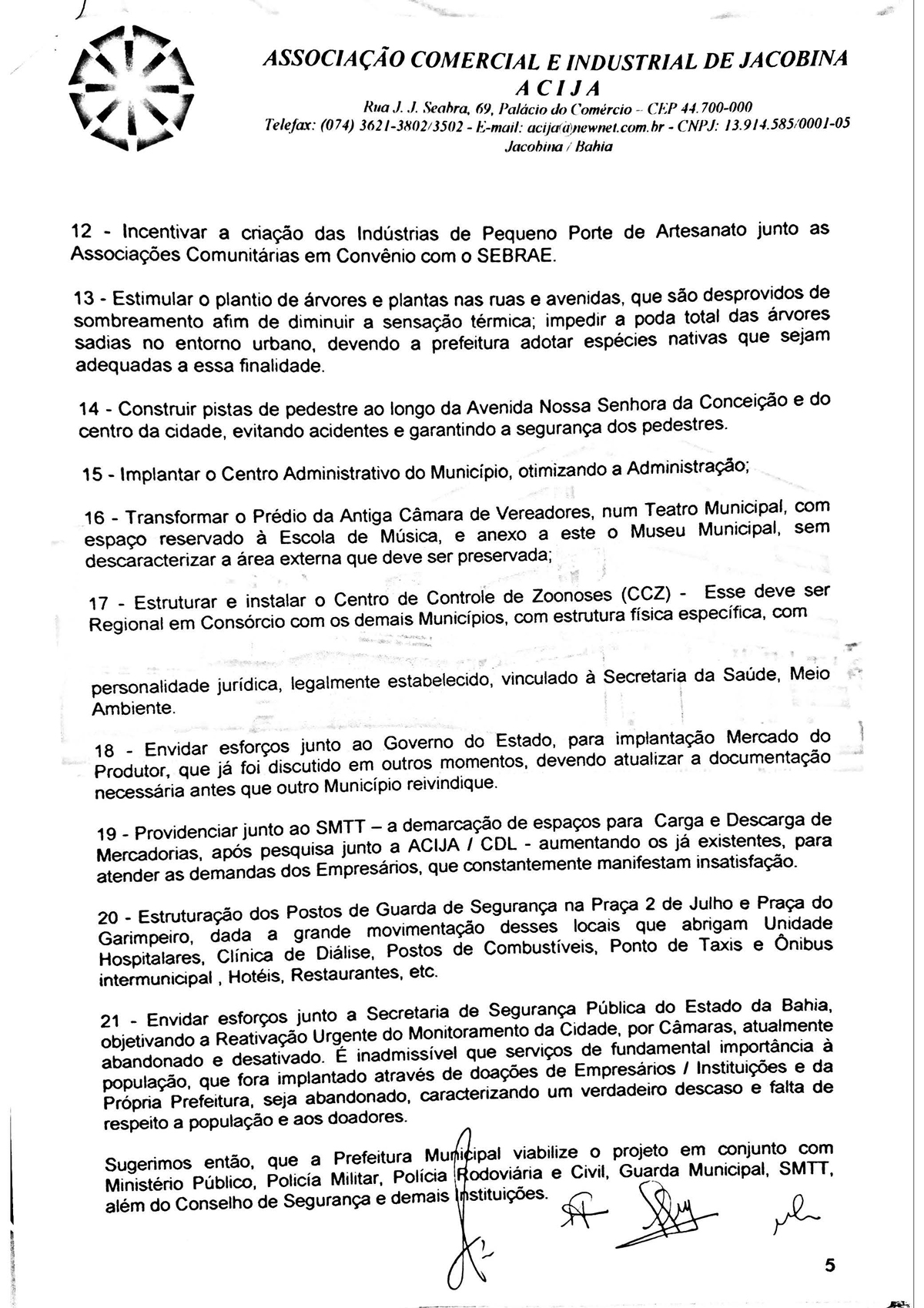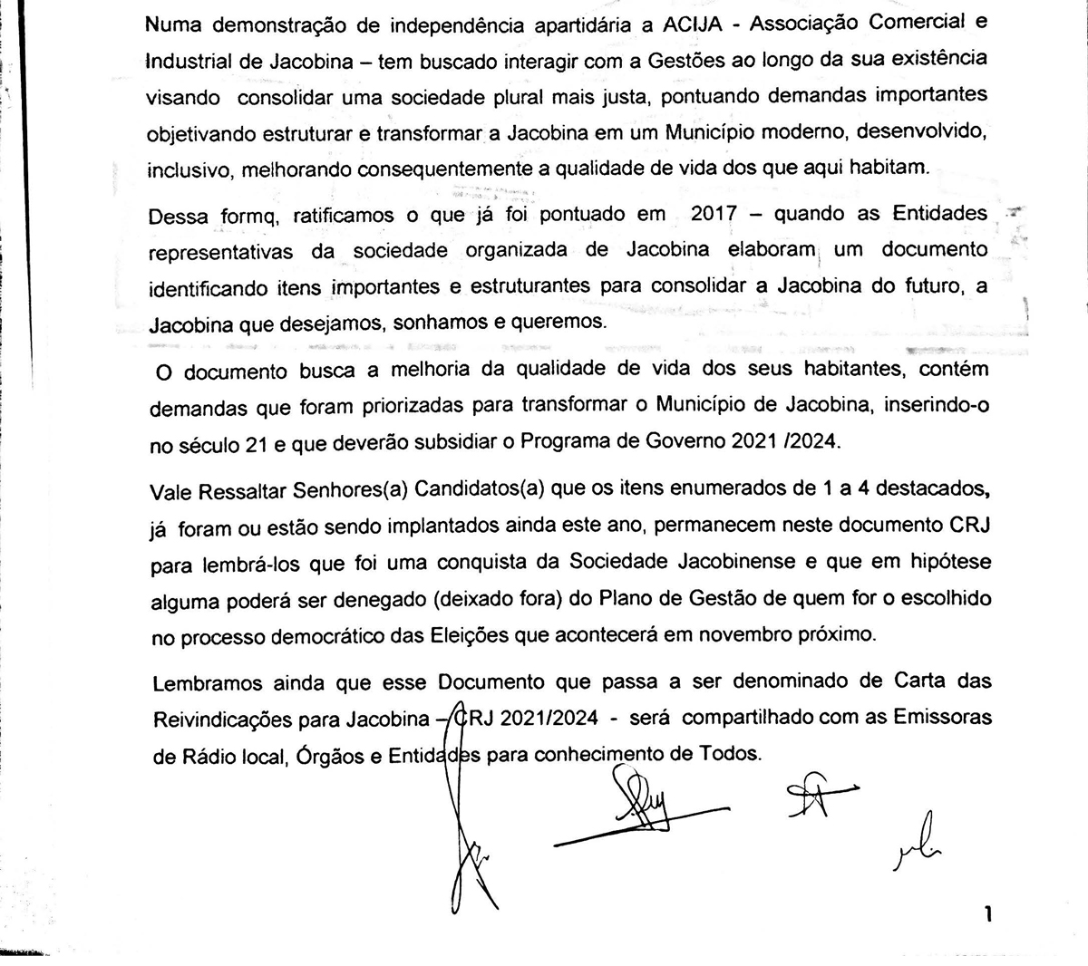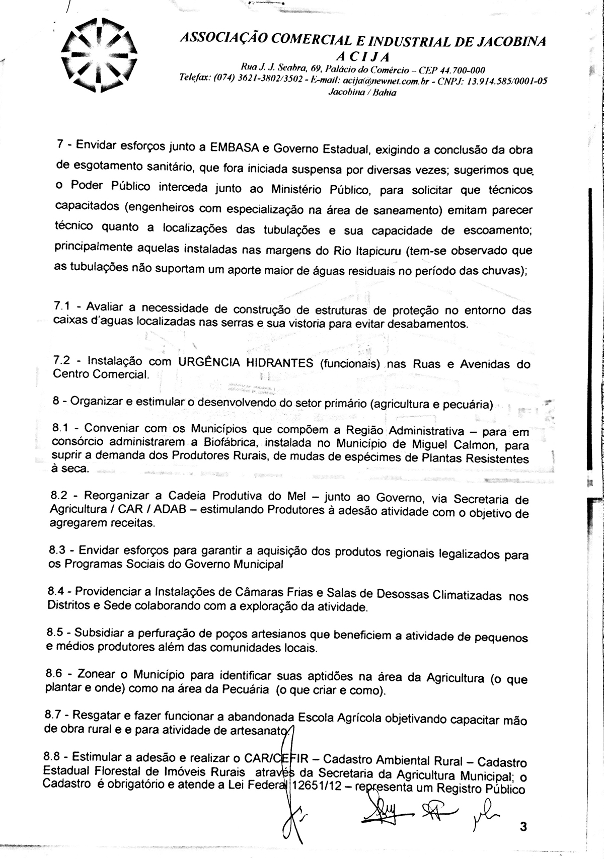 A Associação Comercial e Industrial de Jacobina - Acija, por meio da sua diretoria executiva protocolou um documento com os candidatos a prefeito de Jacobina, denominado “Carta das Reinvindicações para Jacobina”, cujo objetivo foi pontuar demandas estruturantes para a cidade, inserindo o município num processo de desenvolvimento do Século XXI, tornando o aqui viver melhor.