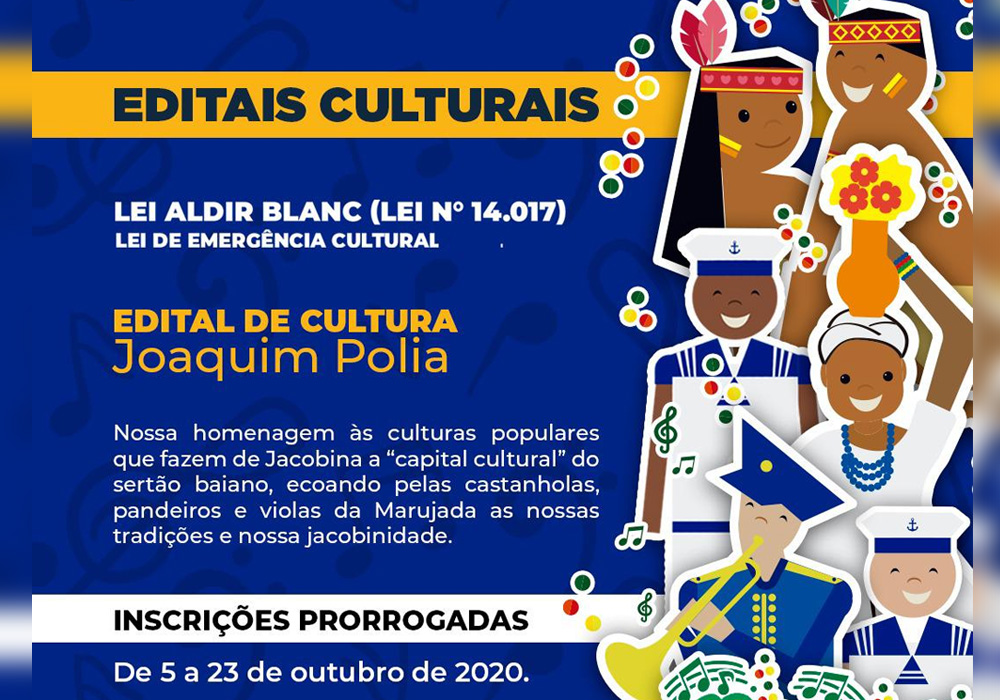 A Prefeitura de Jacobina, por meio da Secretaria Municipal da Educação e Cultura, via Diretoria de Cultura, informa que, em atendimento à Lei de Emergência Cultural Aldir Blanc (nº 14.017, de 29 de junho de 2020), estão prorrogadas as inscrições para os editais  “Joaquim Polia” e “Bob Silva” , que deverão ocorrer no período de 5 a 23 de outubro de 2020, pelo site oficial de Jacobina (www.jacobina.ba.gov.br).