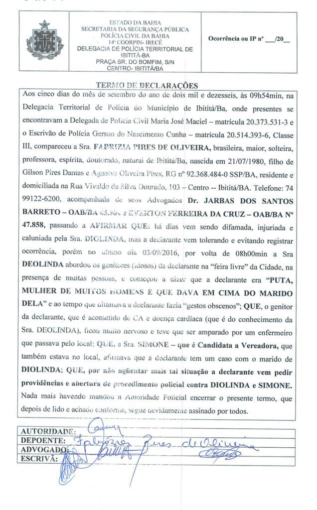 Não é a primeira vez que a família do réu se envolve em confusão, como comprova Boletim de Ocorrência registrado na Delegacia de Ibititá. Em um episódio recheado de xingamentos e insinuações de adultério, Diolinda Dourado, esposa de Cói, foi acusada por Fabrízia Pires Oliveira, atual candidata a vice-prefeita na chapa de Afonso, por difamação, injúria e calúnia. De acordo com o B.O, Diolinda abordou os pais de Fabrízia na feira livre da cidade e a xingou de “puta”, também acusando-a de "seduzir homens casados".