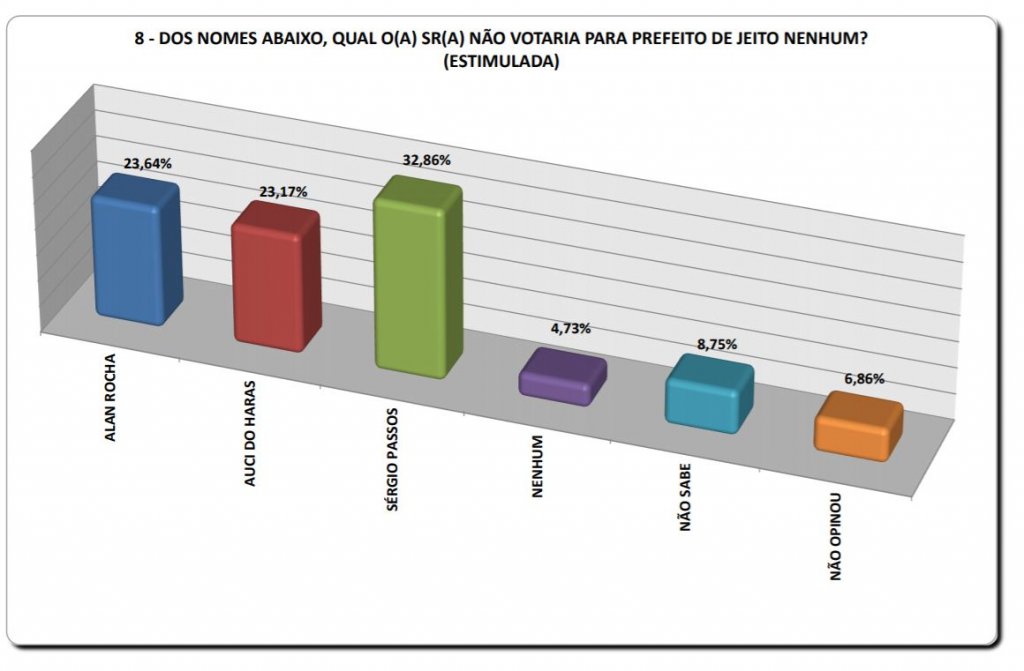 No cenário que mede a rejeição dos candidatos, em que são analisados dados sobre quem os eleitores não votariam de jeito nenhum, Sérgio Passos aparece na frente com 32,86%, Alan Rocha é o segundo com 23,64% e Auci do Haras tem 23,17%.
