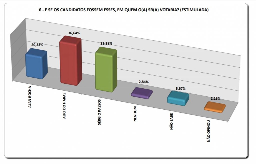 Na pesquisa estimulada, Auci se mantém na frente com seus 36,64%. Ele é seguido de perto por Sergio Passos que soma 32,39%. Alan Rocha tem 20,33%. Os demais eleitores não escolheram nenhum (2,84%), não souberam (5,67%) e não opinaram (2,13%).