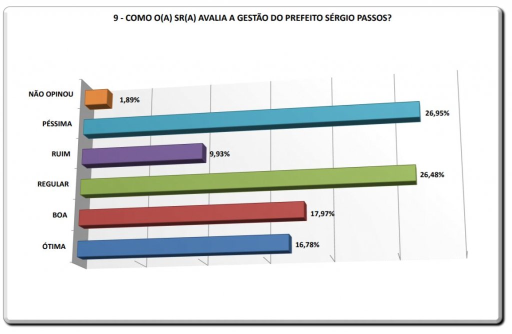 A administração do prefeito Sergio Passos vou avaliada pelo eleitores de Saúde. A maioria considera "péssima". 26,95% classificaram dessa forma.