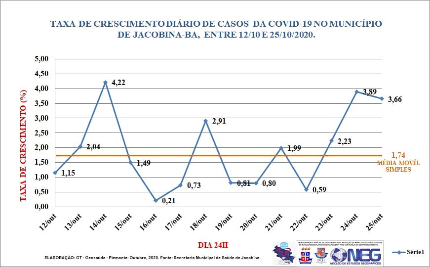 A taxa de crescimento diário encontra-se 1,74% voltando a ficar acima dos 1% recomendável pelas organizações de saúde, em decorrência do alto número de casos ativos registrados. Indicamos o reforço imediato em ações preventivas para tentar controlar o crescimento dos casos ativos.