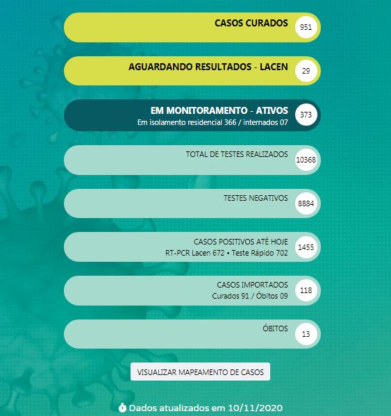 Segundo os números divulgados pela Secretaria de Saúde no boletim de ontem, em 24 horas a cidade teve 81 casos positivos da doença. A cidade passou de 1374 para 1455 casos positivos. Os casos ativos pularam de 324 para 373, com 366 pessoas em isolamento e 7 internadas.
