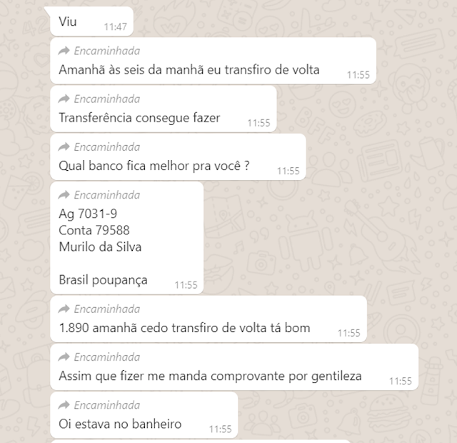 Segundo ela, os criminosos mantiveram contato através do whatsap clonado de uma amiga, e pediu a transferência do valor de R$ 1.890,00, mas ela só conseguiu transferir R$ 1.500.