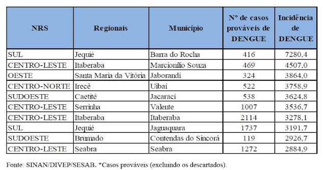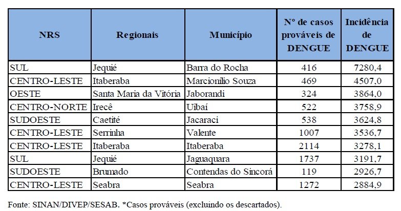 Os municípios com maiores incidência da doença são Itaberaba que possui até o momento 2.114 casos prováveis, Jaguaquara com 1.737 e Seabra com 1.272. Confira a lista completa abaixo: