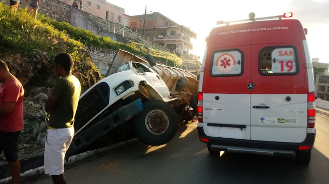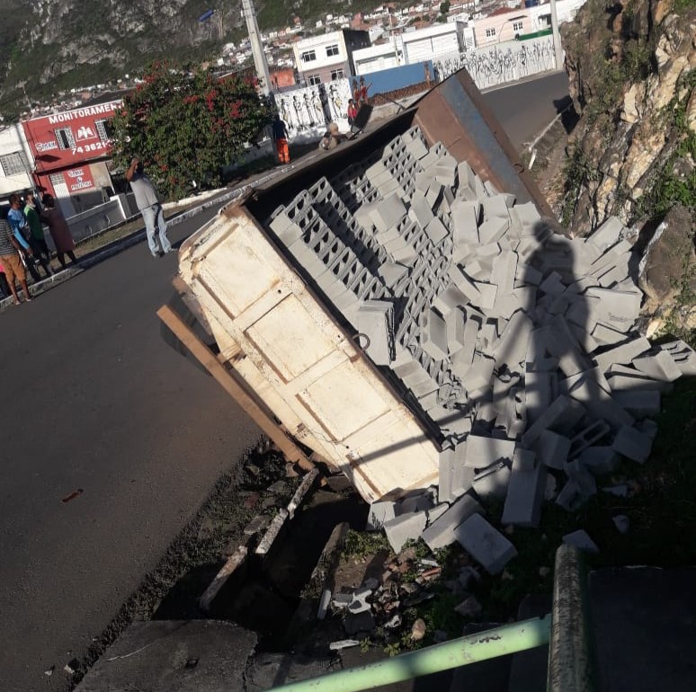 Uma caçamba tombou na margem da Rua Caminho das Árvores, em Jacobina, na tarde desta quarta-feira (25), e deixou o motorista levemente ferido. O veículo, que estava carregado com blocos, caiu entre uma área de drenagem da via e um paredão de pedras.