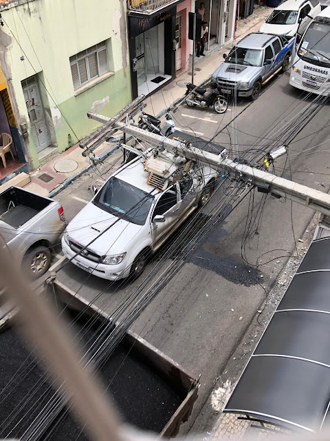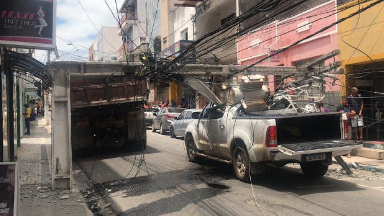 Uma caçamba atingiu um poste da rede elétrica na manhã desta quarta-feira (2), na Rua Manoel Novais, no centro de Jacobina. Com o impacto, o poste rompeu os cabos de transmissão de energia e caiu sobre um veículo Hilux.