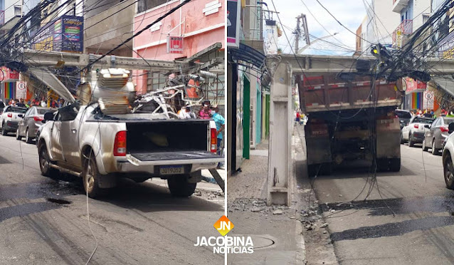 Na quarta-feira, uma caçamba derrubou um poste de energia, na rua Manoel Novais, ao tentar passar ao lado de outro veículo que estava estacionado irregularmente na via. O centro da cidade e mais alguns bairros ficaram sem o fornecimento até que o problema fosse resolvido.