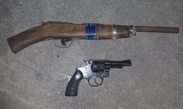 Após as informações colhidas, os policiais militares iniciaram diligências e, ao chegar nas proximidades do local, foram surpreendidos por disparos de armas de fogo. Diante da situação, os policiais e protegeram e iniciaram o revide, ao tempo que pediram reforço à Central da 24ª CIPM por estarem em inferioridade numérica. Durante a troca de tiros, os policiais resolveram se aproximar em incursão cautelosa, momento em que avistaram um dos indivíduos, de 25 anos, alvejado no chão e portando duas armas de fogo, um revólver calibre 32, carregado com 6 cartuchos, sendo que 02 deflagrados, e uma espingarda de fabricação caseira carregada com chumbo.