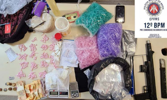 Uma mulher foi presa em Camaçari, na região metropolitana de Salvador, com drogas e uma submetralhadora calibre 9mm. O flagrante ocorreu no sábado (12), em uma ação da Polícia Militar no Bairro dos 46.