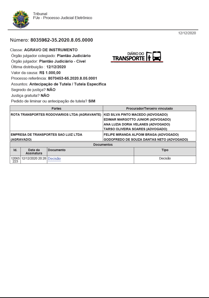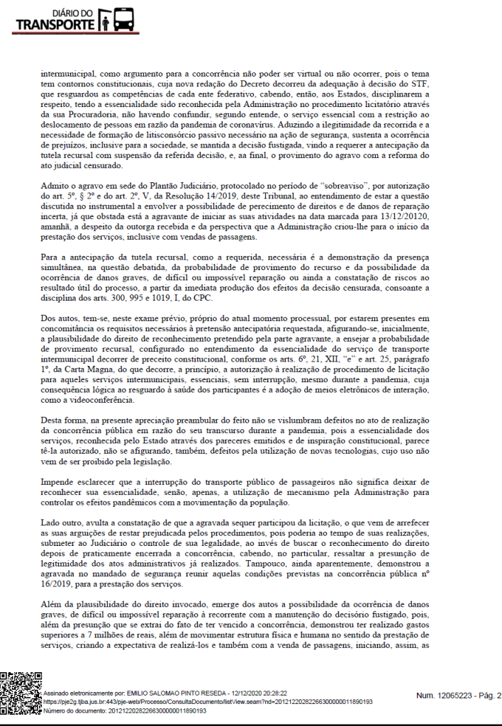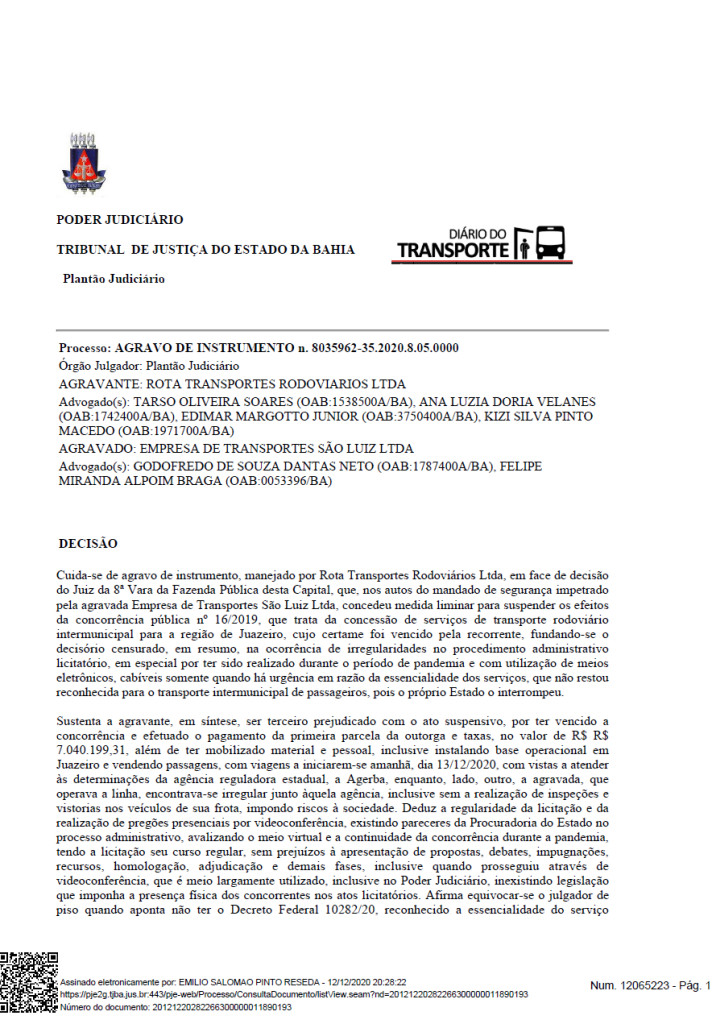 O juiz plantonista Emílio Salomão Resedá, do Tribunal de Justiça do Estado da Bahia, atendeu neste sábado, 12 de dezembro de 2020, recurso da empresa de ônibus Rota Transportes e restituiu os efeitos da licitação do transporte intermunicipal a partir de Juazeiro e Jacoboina, possibilitando assim as operações da companhia juntamente com outra vencedora do certame, a Transoares.
