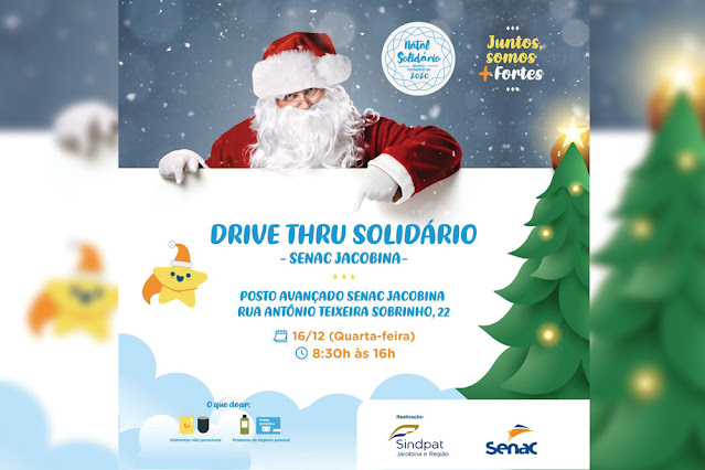 A unidade Senac de Jacobina promoverá nesta quarta-feira, 16, um Drive Thru Solidário em apoio às famílias carentes da cidade. A ação ocorrerá na Rua Antônio Teixeira Sobrinho, 22 e tem a participação também da equipe do Sindpat.