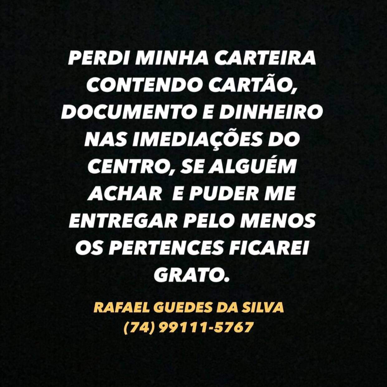 A carteira foi perdida próximo ao centro da cidade, para quem encontrou poderá entrar em contato com a redação do site Jacobina Informa ou conversar com Rafa Guedez nas suas redes sociais.