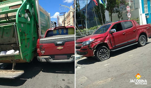 Uma colisão envolvendo uma caminhonete S10 e um caminhão coletor de lixo foi registrada na manhã desta quinta-feira (24), na Rua Senador Pedro Lago, centro de Jacobina. O trânsito ficou parado no local devido a obstrução dos dois veículos envolvidos na colisão.