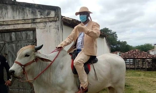 O prefeito eleito de Jacobina, Tiago Dias (PCdoB), seguiu para tomar posse na Câmara de Vereadores nesta sexta-feira, 1° de janeiro de 2021, montado em um boi e vestido com um gibão de couro, roupa de vaqueiro.