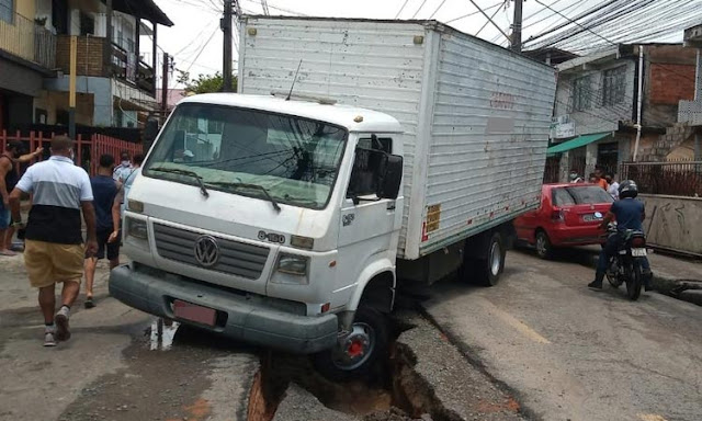 Um caminhão ficou preso em uma cratera na Estrada das Barreiras, em Salvador, nesta sexta-feira (8), aberta após o asfalto ceder no local. Não houve registro de feridos.