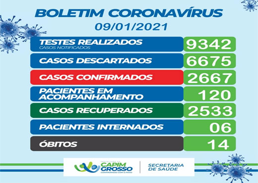 A Secretaria Municipal de Saúde, por meio da Vigilância Epidemiológica, informa que, sábado, dia 09 de Janeiro de 2021, Foram notificados e confirmados 03 (três) casos POSITIVOS para COVID-19 e 01(um) óbito.