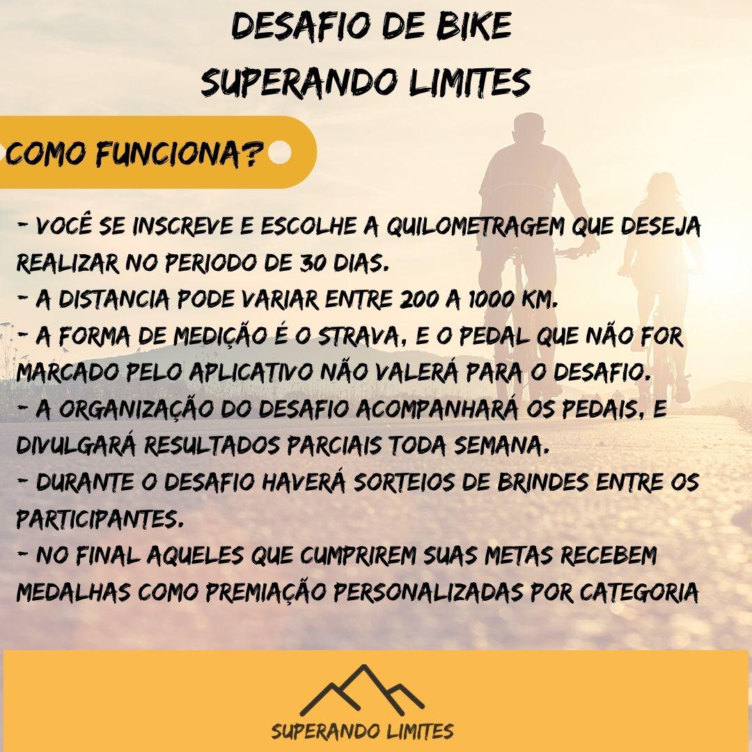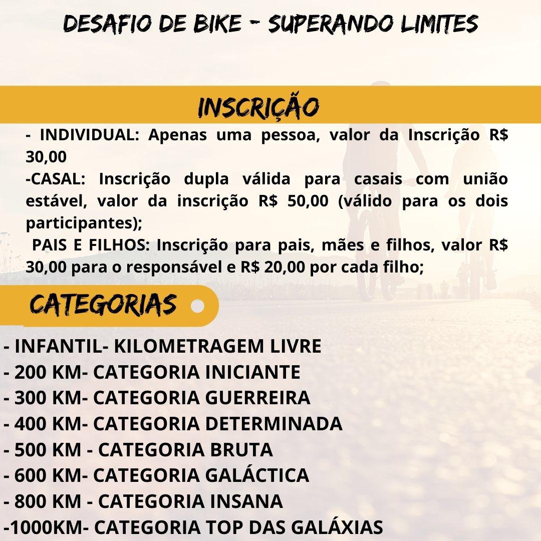 A partir da próxima segunda-feira (18/01), os ciclistas de Jacobina e região poderão participar de uma competição diferente, o Desafio de Bike Superando Limites. Os participantes terão 30 dias para cumpri uma meta que é estabelecida por ele mesmo, a distância varia entre 200 a 1000 km, divido em 8 categorias.